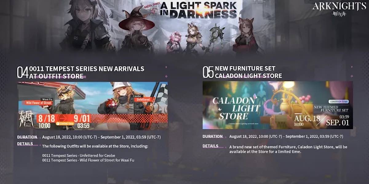 กิจกรรม Arknights ใหม่ เป็นกิจกรรมคอลเลกชันเรื่องราวของ A Light Spark in Darkness สำหรับเกม RPG แนววางแผนมือถือ ได้รับการเผยแพร่สู่สาธารณะแล้ว บอกเล่าเรื่องราวเกี่ยวกับผู้ติดเชื้อที่ชื่อ Goldenglow ในหมู่บ้าน Caladon อันเงียบสงบ